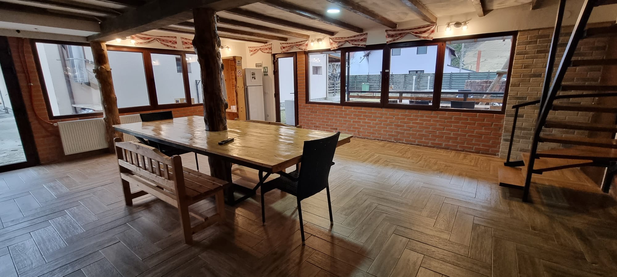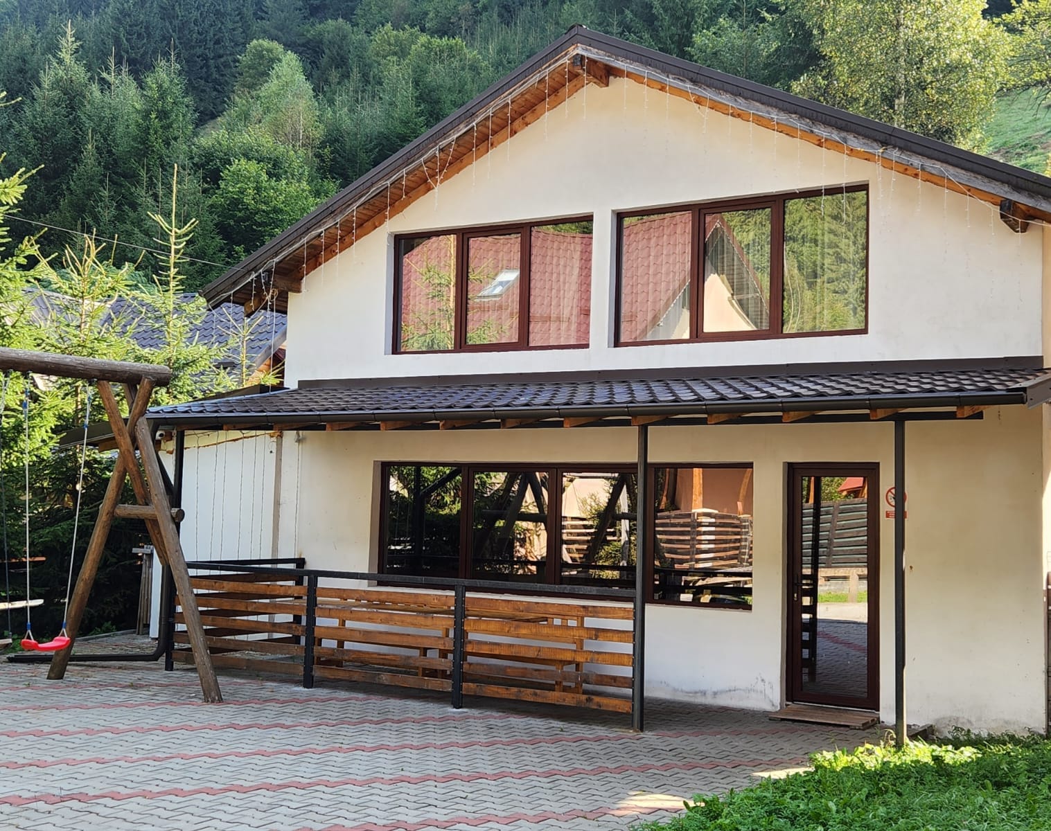 Pensiunea El Monte poate acomoda 24 adulti si 8 copiii in 8 camere si 4 apartamente plus 6 adulti si 1 copil in Vila Dani, cu 3 dormitoare. La parterul pensiunii se afla restaurantul iar pentru cei care doresc sa-si pregateasca singuri mesele sau doar un gratar, le punem la dispozitie un foisor inchis pe 2 nivele. La parter se afla gratarul, plita electrica pe inductie, chiuveta, frigider, vesela, mese, iar la etaj inca 2 frigidere, mese si toaleta de serviciu, acesta fiind un plus important cand sunt 2 grupuri, fiecare beneficiind de intimitate. Pe timpul iernii, foisorul este incalzit. Atat foisorul cat si vilele, dispun de terase.